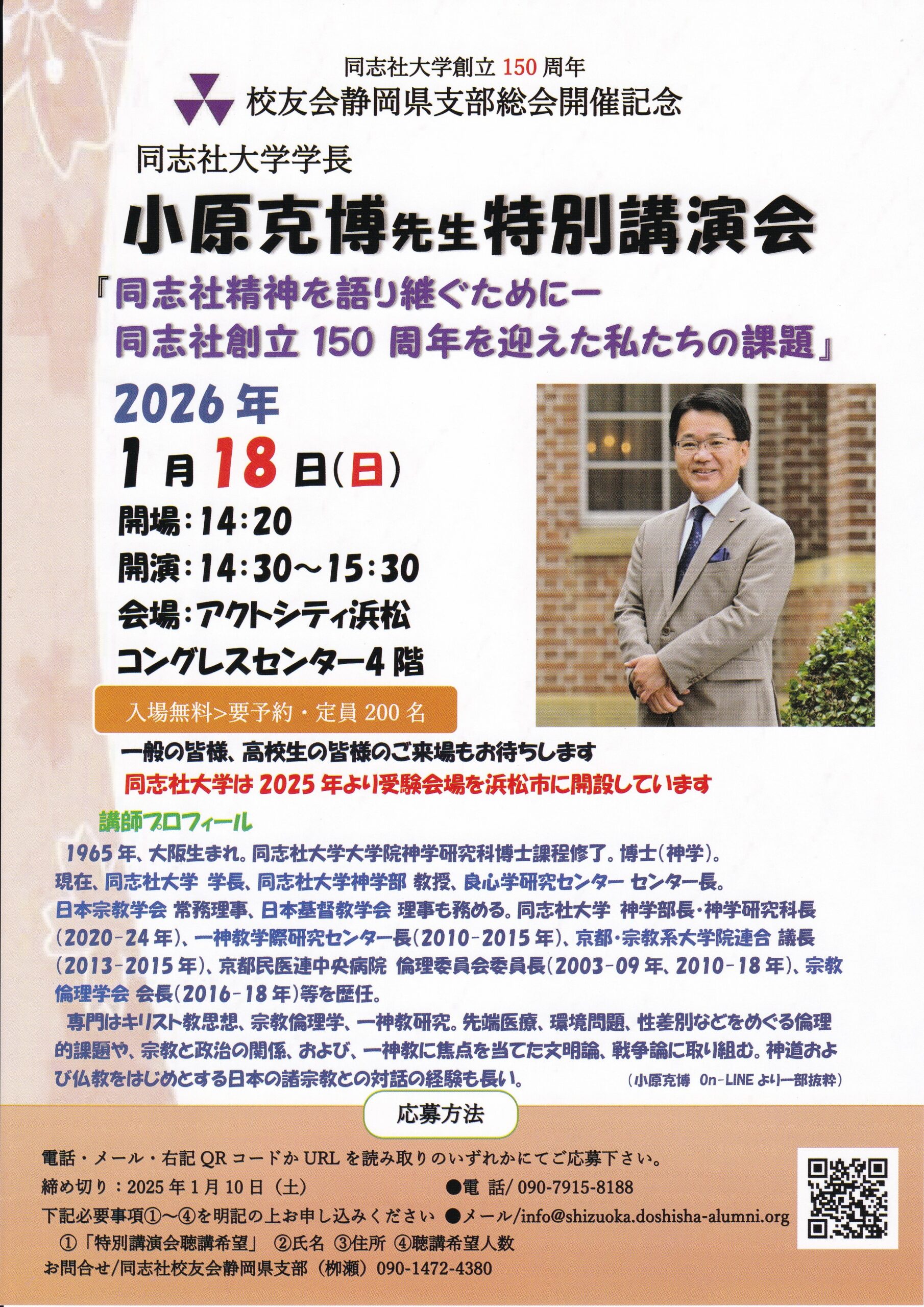 総会終了後には昨年4月より、同志社大学第35代学長に就任された小原克博先生をお招きして、創立150周年を迎え更なる200年へ向けた新たなビジョン等についてご講演を頂く予定です。